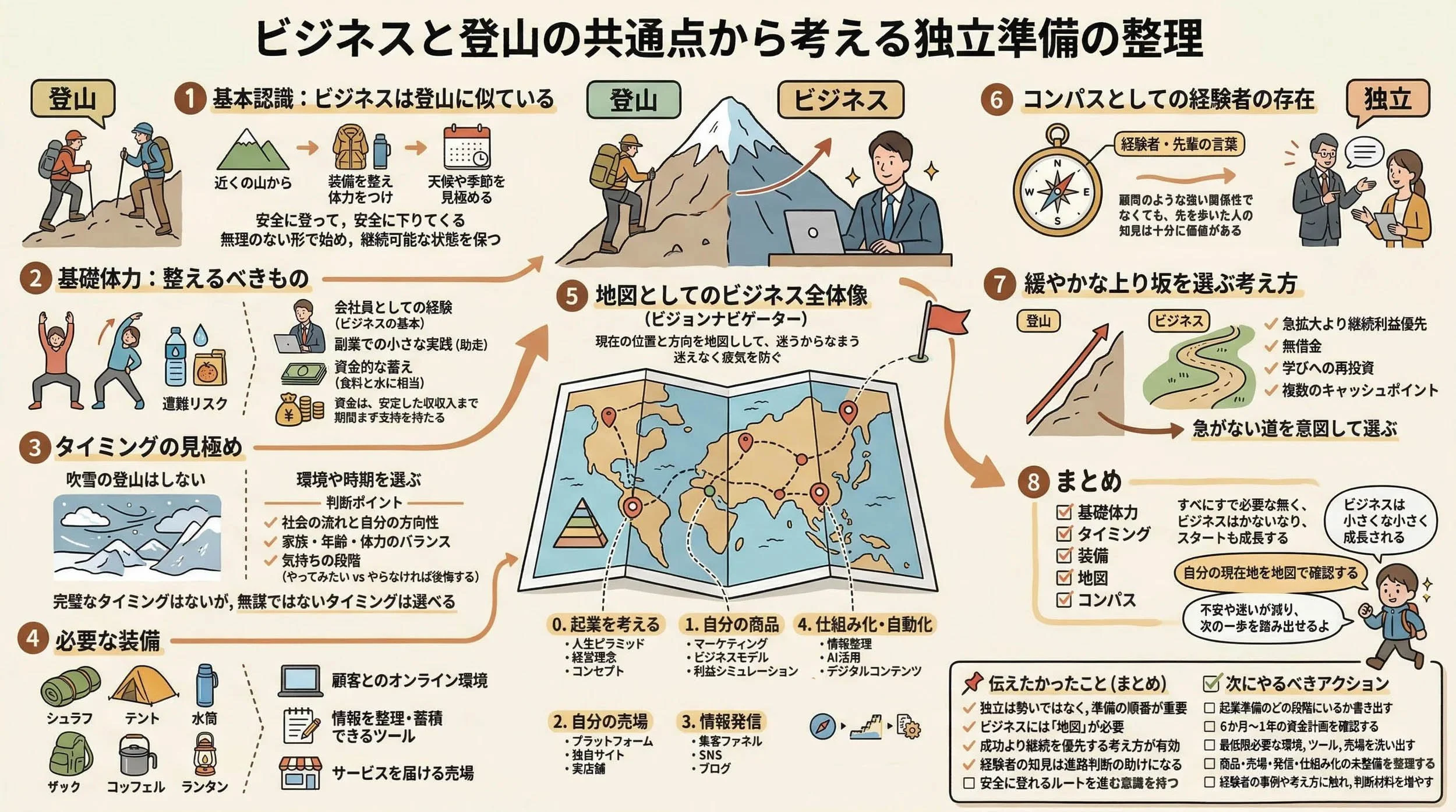 この記事では、 独立・起業を考えているあなたに向けて、 山岳部での経験をもとに 「準備と地図」の考え方を整理します。