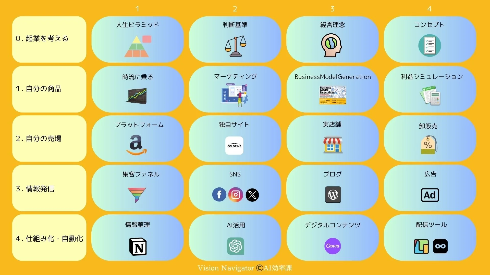 私が実際に歩んできた道のりの中で整理し、 オンラインサロン「AI効率課」でお伝えしているビジネスの地図が、 「ビジョンナビゲーター」です。