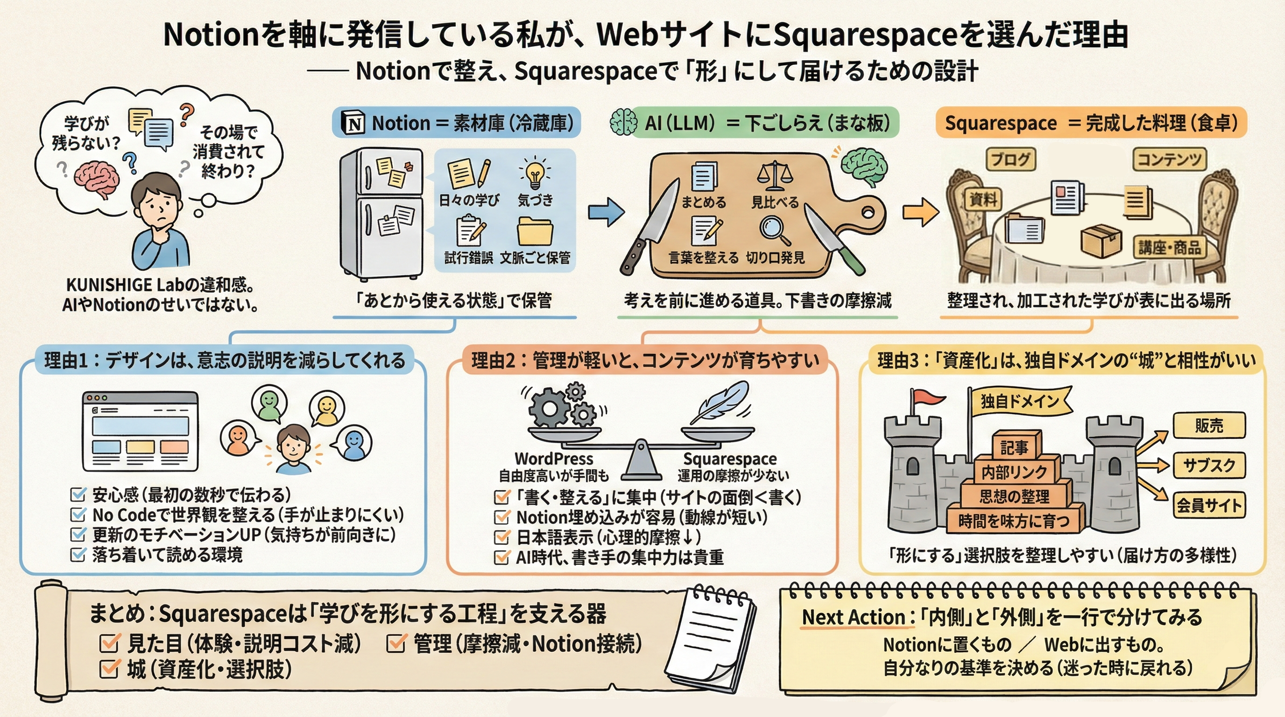 ※ Notionで整理した学びを、Squarespaceで「形」にして届けるWebサイト設計とその選定理由を表した図